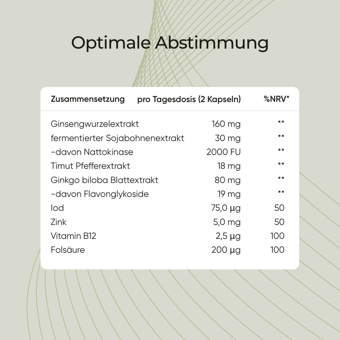 Nach jahrelanger Forschung haben wir eine einzigartige Kombination aus Timut Pfeffer-Extrakt, Nattokinase und Ginkgo entwickelt, die durch wichtige Mikronährstoffe ergänzt wird.